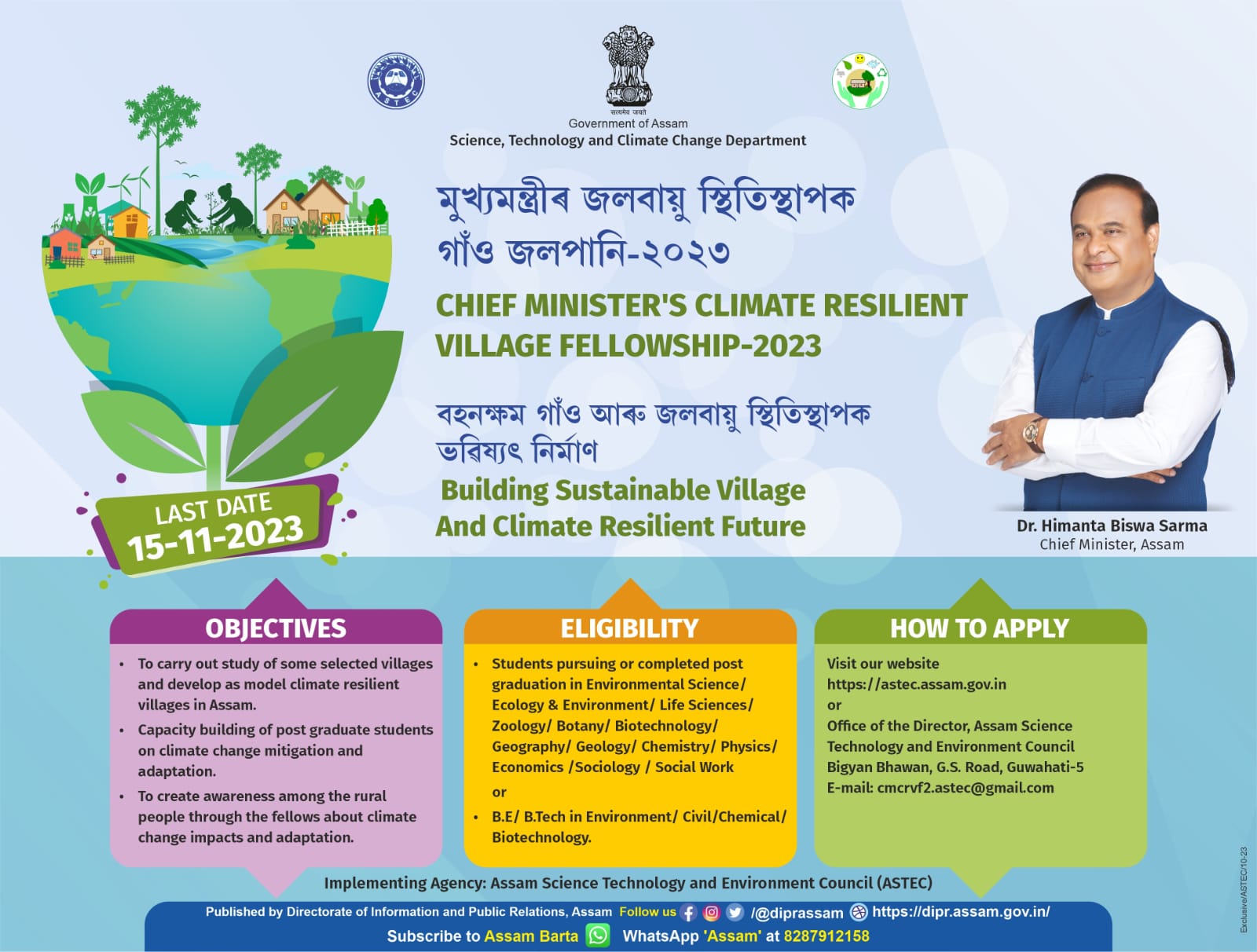 The Science and Technology and, Government of Assam invites participation of young students to work towards creation of climate resilient village under the scheme “Chief Minister’s Climate Resilient Village Fellowship Programme (CMCRVF)”.